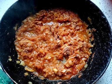 Затем выложите к овощам тушенку, предварительно немного размяв ее вилкой. Жир от тушенки можете не класть. Обжаривайте все вместе примерно 5 минут. Попробуйте мясо на соль и перец, при желании добавьте их.