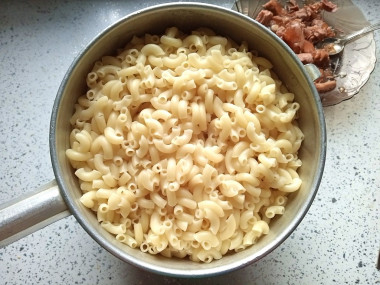 Готовые рожки откиньте на дуршлаг. Затем закиньте их к тушенке на сковороду. Перемешайте и прогрейте все вместе на небольшом огне под крышкой.