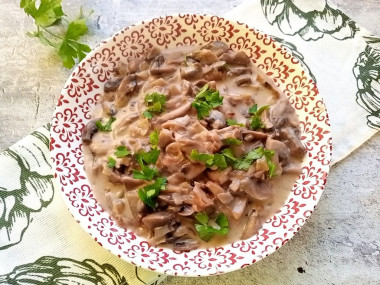 Когда жидкости практически не останется, влейте в грибы сметану. Перемешайте продукты и оставьте блюдо немного покипеть под крышкой на маленьком огне. Затем огонь выключите.