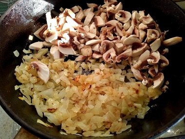 Затем выложите к луку грибы. Посолите и поперчите их, перемешайте. Накройте сковороду крышкой, огонь сделайте небольшим.