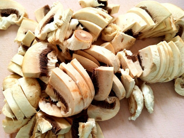 Шампиньоны аккуратно помойте, стараясь мочить грибы не слишком сильно — напитавшиеся влагой, они станут невкусными. Выложите их на бумажное полотенце, которое впитает лишнюю воду. Нарежьте шампиньоны довольно крупно — четвертинками или большими дольками. При жарке они значительно потеряют в объеме.
