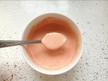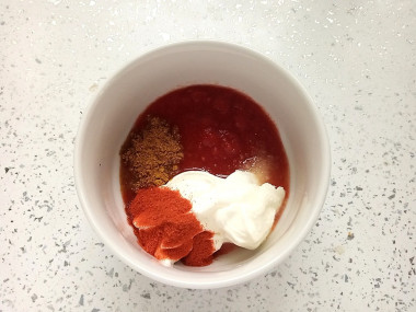 В мисочке соедините аджику средней остроты со сметаной. Если аджика сильно острая, можете развести ее таким же количеством томатной пасты или томатного соуса. Чтобы курица получилась менее острой, можете уменьшить количество аджики или заменить ее на сладкий соус чили.