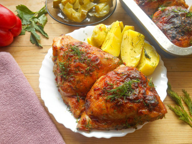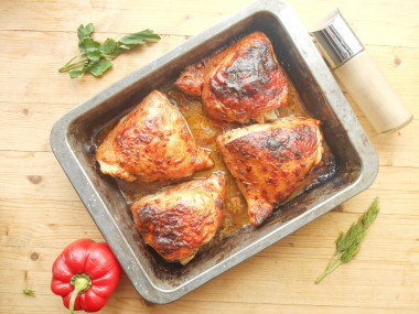 Я взяла бедра на кости и разделила каждое пополам для удобства. Для маринада взяла домашнюю острую аджику, сметану 25%, паприку, немного соли и приправу для курицы. Аромат потрясающий! Все это великолепие пропитывало курочку часов 10 в холодильнике. Для удобства мариновала в пакете, который периодически переворачивала. Запекала куриные бедра в течение часа при 180°С. Они хорошо зарумянились, кожица стала хрустящей, а само мясо мягким! Бедрышки вкусные, с приятной остринкой! Благодаря аджике присутствуют нотки чеснока и острого перца. Можно заменить ее на кетчуп с определенными специями и вкус будет немного иным. Сметана смягчает мясо, делает его нежным.
