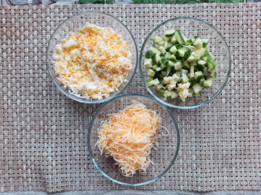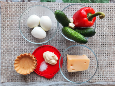 Как сделать тарталетки с сыром и огурцом? Подготовьте для этого необходимые ингредиенты. Количество и пропорции примерные, поэтому что-то можно добавить чуть больше или меньше.
