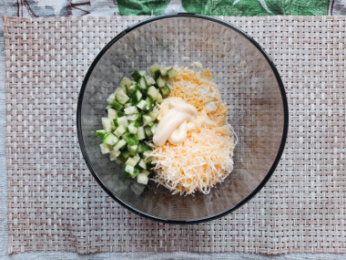 Свежий огурец нарежьте мелкими кубиками и выложите в чашу к яйцам. Очистите пару зубчиков чеснока. По вкусу добавьте соль и немного молотого перца. Добавьте майонез и все ингредиенты смешайте до однородности.