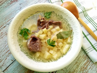 Мне понравился классический суп из говядины с картошкой простотой приготовления и минимальным набором продуктов. Я варила его из небольшого кусочка говядины. Поэтому мясо было готово уже через час. Бульон при этом получился прозрачным. Лук я обжарила с минимальным количеством масла, чтобы суп получился более диетическим. Специи никакие не добавляла, хотелось почувствовать натуральный вкус мясного бульона. Дочке в этом супе не хватило вермишели, а мне и в таком виде понравилось, очень вкусно.