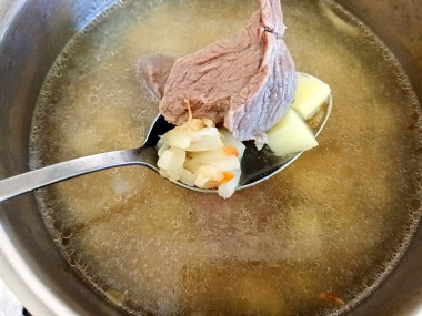 Мясо залейте водой, поставьте на огонь и доведите до кипения. При нагревании будет появляться пенка, которую необходимо снять. Проварите мясо 1-1,5 часа. Когда мясо сварится извлеките его из бульона и нарежьте на кусочки. Бульон можно процедить. Так он будет более прозрачный. Нарезанное мясо верните в бульон. Доведите до кипения.
