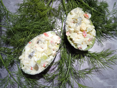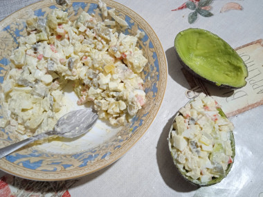 Приготовила авокадо с крабовыми палочками салат на закуску. Очень красивое оформление салата в тарелочках из авокадо. Для приготовления по совету автора взяла ещё варёные яйца и лук, а свежий огурец заменила маринованным. Вынула косточку из авокадо, достала аккуратно мякоть и сбрызнула всё лимонным соком. Нарезала кубиками огурцы, крабовые палочки, авокадо, яйца и лук. Заправила майонезом и наполнила авокадо. Эффектно выглядит закуска. И красиво, и ароматно, и вкусно. Все ингредиенты прекрасно дополняют друг друга. Особенно мне понравилась лимонная нотка в салате. Очень вкусно. На праздничный стол приготовлю побольше такой закуски и всем советую. Большое спасибо автору!