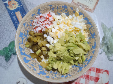 В салатнике соедините нарезанные ранее крабовые палочки, авокадо, и огурец. Поперчите, при необходимости посолите и заправьте майонезом. Соль в данном салате можно не использовать вовсе, так как в майонезе она уже присутствует. Ориентируйтесь на ваш вкус.