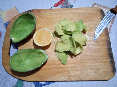 Внутренние стенки авокадо сбрызните лимонным соком, это нужно для того, чтобы они не потемнели. Мякоть также сбрызните лимонным соком.