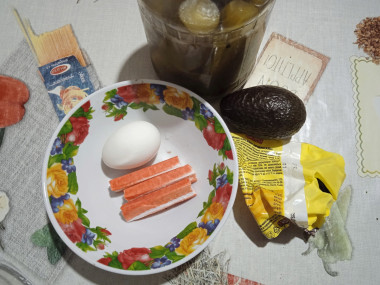 Как сделать авокадо с крабовыми палочками салат? Подготовьте все необходимые ингредиенты по списку.