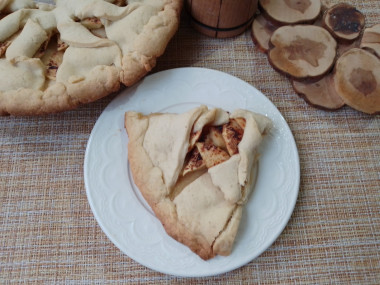 Достала тесто, разделила его на 2 равные части и раскатала 2 круга. Первый, выложила на противень застеленный пергаментной бумагой, сверху горкой уложила яблоки и присыпала их сахаром и корицей. Второй круг теста разрезала по кругу и завернула каждую часть, как описано в рецепте. Аккуратно перенесла тесто на пирог, защипила края и поставила выпекаться.