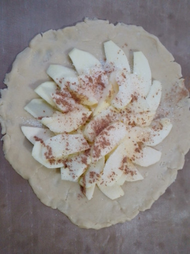 На раскатанный корж выложите ломтики яблок, оставляя свободными края. Каждый слой яблок пересыпайте сахаром и корицей. Сахар добавляйте по вкусу в зависимости от сладости фруктов. Если корицу не любите, не добавляйте.