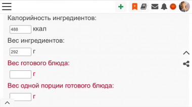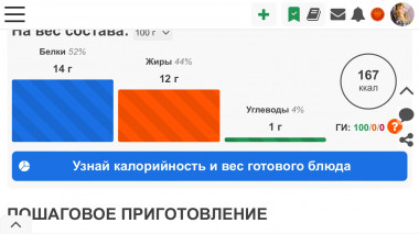 В таблице БЖУ перед пошаговыми фото есть синяя кнопочка: Узнай калорийность и вес готового блюда.