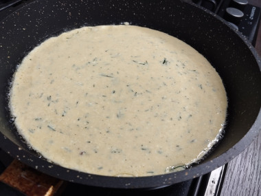 Сковороду разогрейте на среднем огне, смажьте растительным маслом. Вылейте в сковороду омлетную смесь. Учтите, что от размера вашей сковороды напрямую зависит диаметр и толщина готового омлета. У меня диаметр сковороды 22 см, можно брать сковороду как больше, так и меньше.