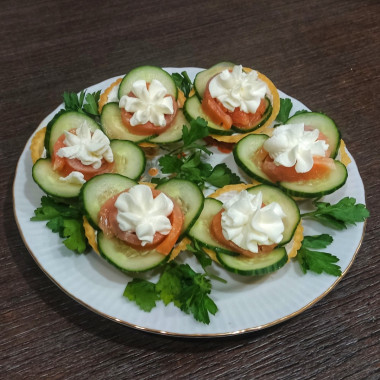 Отличная закуска,которая украсила праздничный стол: тарталетки с творожным сыром,огурцом и рыбой! На приготовление ушло минимум времени, а результат замечательный: очень вкусненько получилось. Огурец порезала на тонкие колечки, рыбу( у меня была малосольная форель) на длинные ломтики. Тарталетки смазала творожным сыром, затем выложила колечки огурца. Ломтики рыбы свернула кружочками и выложила на огурцы. Творожный сыр выложила в кондитерский мешок с насадкой "закрытая звезда". И в центр рыбки выдавила творожный сыр.