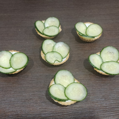 В корзиночки вертикально вставьте кружочки огурцов внахлест. Лучше брать тарталетки небольшого диаметра, но если купили более широкие - ничего страшного. В них закуска тоже неплохо смотрится.