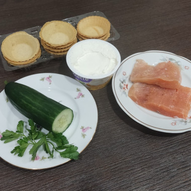 Как сделать тарталетки с творожным сыром, огурцом и рыбой? Очень просто! Для начала подготовьте необходимые ингредиенты. Творожный сыр можете заменить любым другим; плавленым, фетой, брынзой, рикоттой. Если тарталетки средней величины, то нам понадобится около 10 штук. Если тарталетки мелкие, то такого количества начинки хватит на 20 тарталеток. Тарталетки можно взять магазинные, а можно приготовить такие самостоятельно.
