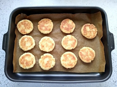Верх пышных сырников пришлепните лопаткой. Запекайте сырники 15 минут на одной стороне, затем противень выньте и переверните их на другую сторону. Пеките еще 7-10 минут, до румяности уже снизу. Готовые сырники выньте из духовки и снимите с бумаги на тарелку.