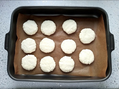 Включите духовку разогреваться на 180°С. Возьмите противень и застелите его бумагой для выпечки (я взяла тефлоновый коврик). Если вы не уверены в качестве своего пергамента, то смажьте его каплей растительного масла. Руками сформируйте сырники одинакового размера и выложите их на противень на небольшом расстоянии друг от друга. Чтобы ПП сырники получились одинаковыми и ровными, накройте их стаканом и с небольшим усилием прокрутите несколько кругов.