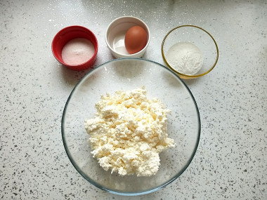 Творог сложите в миску, добавьте в него желтки, всыпьте сахар, щепотку соли — она усилит и сбалансирует вкус. Всыпьте рисовую муку. Перемешайте все продукты при помощи вилки до однородности. Если у вас сильно крупинчатый творог, то можете пробить тесто блендером. Если творог был очень влажный, то муки можно добавить еще, чтобы тесто получилось достаточно густым.