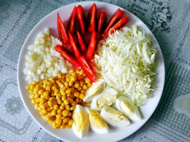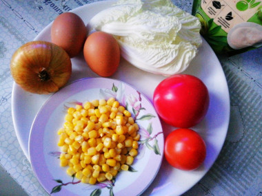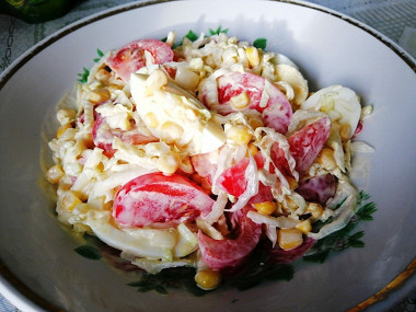 Салат готовила из помидоров, яиц, лука, пекинской капусты и консервированной кукурузы. Лук предварительно порезала и замариновала в 9% уксусе. Пекинскую капусту мелко нашинковала. Помидоры и вареные яйца порезала крупными дольками. Крупная нарезка помидоров и яиц в салате мне очень понравилась. Чувствовался и вкус продукта, и обволакивающего его соуса. Просто замечательно!