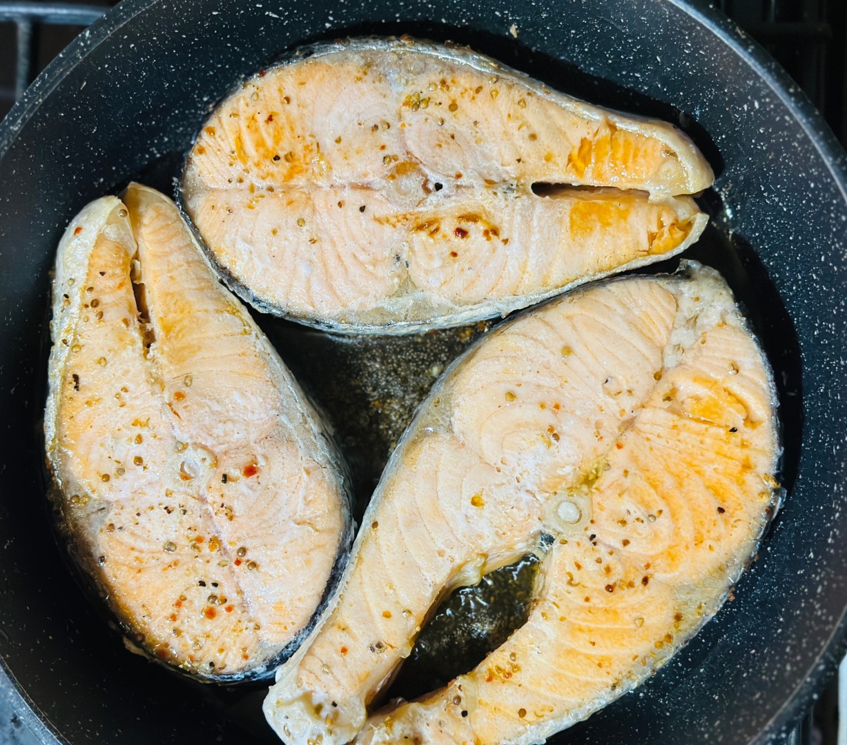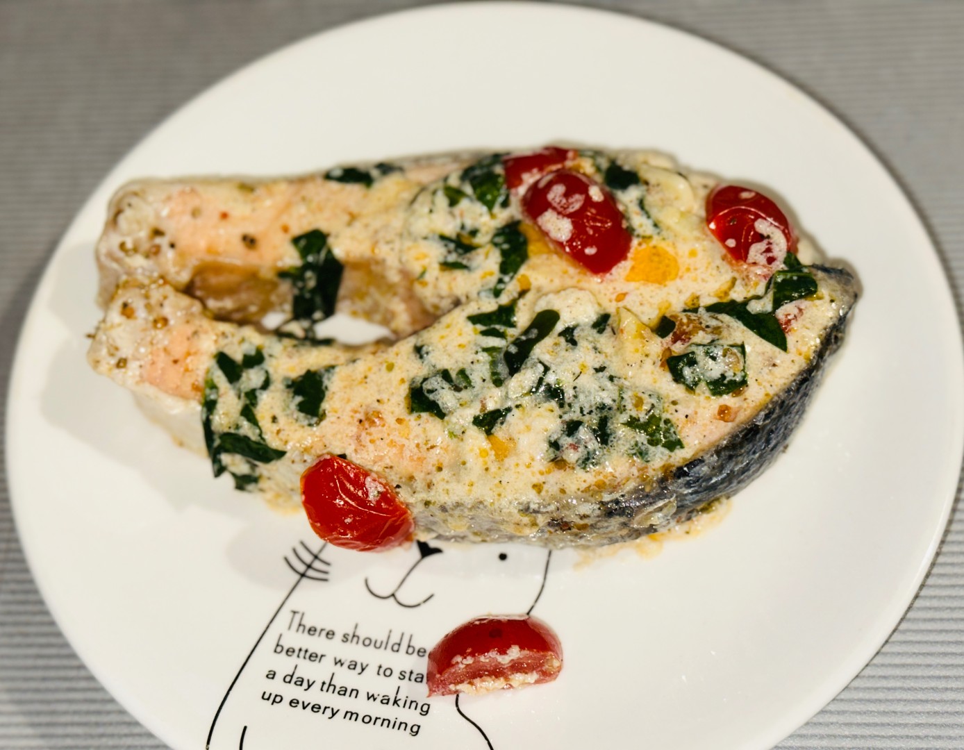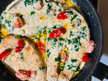 Очень люблю такие красочные блюда! Использовала стейки атлантического лосося, обжарила на оливковом масле с двух сторон на небольшом огне примерно по 20 минут каждую. Шпинат у меня крупно листовой- я его порезала, помидорки черри разделила на 4 части. К разогретому сливочному маслу добавила помидоры и мелко нарезанный чеснок. После обжаривания помидоры переложила на тарелку, убрав со сковороды. В горячие сливки добавила чёрный перец, мускатный орех и прованские травы. Закинула туда натертый пармезан, шпинат и помидоры. Далее вернула рыбу в соус. Рыба просто тает во рту, такая нежная, вкус соуса многогранный. Получилось и вкусно и красиво, спасибо Юлия ❤️