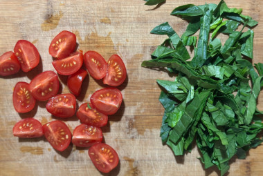 Помидоры помойте, обсушите. У меня черри, которые я разрезала пополам. Можно взять обычные помидоры и нарезать их небольшими кусочками.