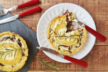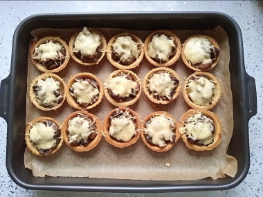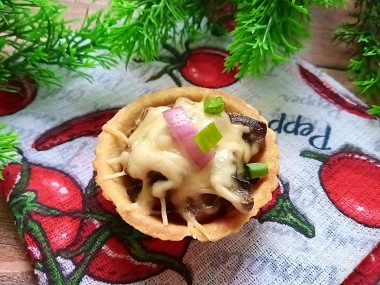 Вкус такой приятный и необычный для меня. Тарталетки запеклись и стали хрустящими! Начинка нежная, сыр тянется! Очень вкусное сочетание и удобная порционная подача!