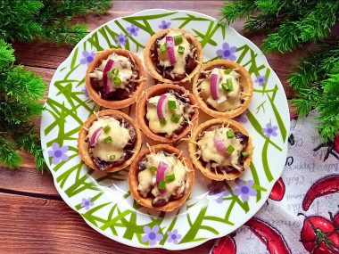 Я для этого рецепта брала большие тарталетки. У меня получилась не совсем праздничная закуска, а больше такая семейная еда.