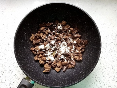 Добавьте в сковороду курицу. Жарьте, помешивая, 5-7 минут до золотистой корочки. Из курицы должна выпариться вся лишняя влага.