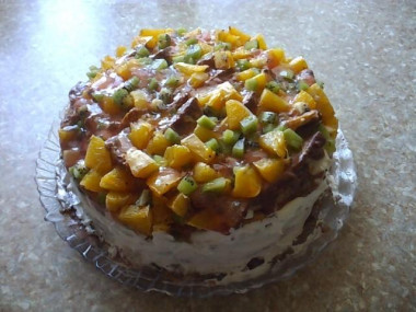 Апельсины и киви очистить, нарезать на небольшие кусочки, выложить на пляцок.