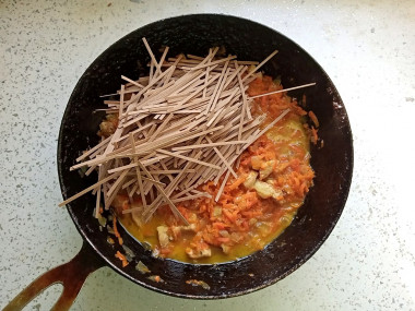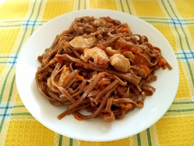 На ужин приготовила вермишель с мясом на сковороде. Очень простой, но в то же время интересный рецепт оказался. Мясо у меня в виде свинины, просто оно быстрее доходит до готовности. Обжарила кусочки до румяности на раскаленной сковороде. А потом потушила с луком и морковью. Вермишель заменила на гречневую лапшу, поломала её на три части. Обычно макаронные изделия я отвариваю отдельно. А тут готовится все вместе. Воду я пару раз подливала, при этом пробовала лапшу на готовность. Получилось просто отлично! Вкусно, сытно и сочно. Мясо мягкое, пропитанное овощными соками. Лапша тоже гораздо вкуснее при таком способе приготовления.