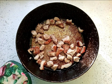 Разогрейте сковороду с растительным маслом и обжарьте мясо на сильном огне со всех сторон до румяной корочки.