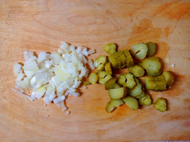 Огурцы также нарежьте произвольно. Можете как я, кружочками, можете соломкой или кубиками. Вместо соленых можете использовать маринованные огурцы.