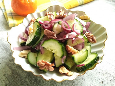 Год кролика мы встречали хрустящим салатом огурцы и орехи грецкие. По составу салат очень простой, но получился он очень вкусным! Красный лук я замариновала заранее, сбрызнула его лимонным соком и посыпала сахаром. Дождалась полного растворения кристалликов и добавила вместе с маринадом к нарезанным огурцам. Грецкие орехи обжарила на сухой сковороде до небольшой румяности и характерного аромата. Сильно не мельчила, поломала на крупные кусочки. Выложила их поверх салата, чтобы не намокли и сохранилась хрустящесть. Впрочем долго салатик на столе не стоял, съели его сразу). Он невероятно сочный и вкусный! Маринованный лук очень хорошо сочетается со свежими огурцами. Это отличный салат, особенно он порадует зимой.
