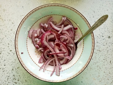 Чтобы лук не горчил в салате, замочите его на 10 минут в ледяной воде. Можете добавить в воду уксус, столовый или винный, тогда лук приобретет легкий привкус. Или, наоборот, вы можете ошпарить лук кипятком — это также избавит его от горечи, но лук станет мягким и не будет хрустеть. Выбирайте сами, по своему вкусу.