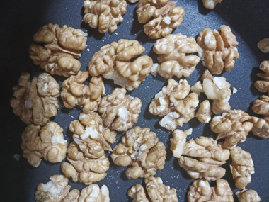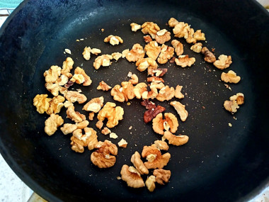 Грецкие орехи высыпьте на сухую сковороду и поставьте на маленький огонь. Подсушите их, помешивая, до легкой хрустящести и приятного аромата. Затем нарежьте небольшими кусочками.
