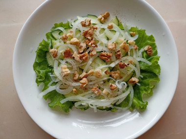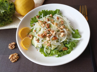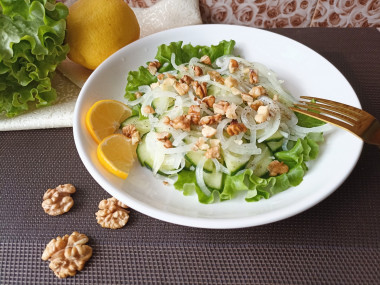 Выложите на плоское блюдо кусочки огурцов, сверху разложите перья лука и орехи. Сбрызните салат лимонным соком, вместо него можете взять винный уксус. Посолите и поперчите по вкусу. Полейте салат маслом, любым растительным, у меня оливковое.
