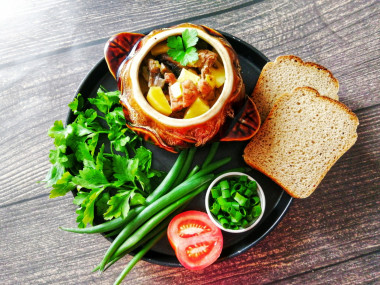Честно говоря, у меня получилось не очень… может надо было подольше подержать, хорошо хоть лук сразу с грибами обжарила, а то бы совсем плохо было бы… мясо жестковато, картошка тоже какая-то так себе😐 хотя все строго по рецепту делала