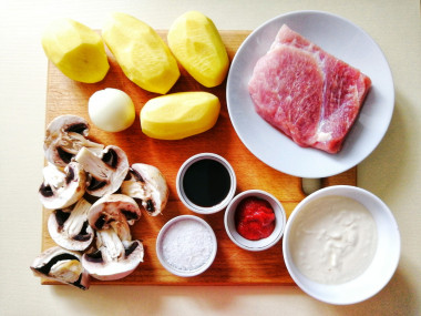 Как сделать жаркое в горшочках с грибами в духовке? Подготовьте для этого необходимые ингредиенты. Для приготовления можно использовать любой вид мяса. Это может быть курица, говядина или, как у меня, свинина. Выбирайте мясо без костей, с минимальным количеством жира. Картофель заранее очистите от кожуры и ополосните от загрязнений в проточной воде. Грибы можно использовать любые. Я беру шампиньоны.