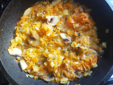 Очистите лук и морковь, ополосните. Лук мелко нарежьте, а морковь потрите на терке. Добавьте лук и морковь в сковороду к грибам и обжаривайте все вместе еще 3-4 минуты. Затем снимите с огня и остудите.