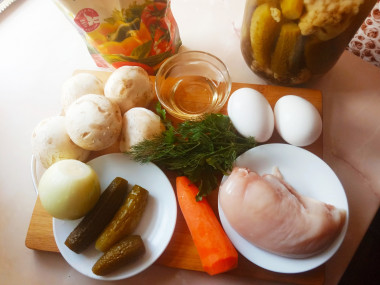 Готовлю салат курица грибы морковь. Отварила курицу, яйца. Лук, морковь, грибы обжарила. Всё хорошо остудила, нарезала маринованные огурчики и яйца, заправила майонезом. Перемешала- салат готов. Сытно, очень вкусно. Полноценный ужин получился. В следующий раз попробую по совету Юли сделать этот салат с корейской морковью. Будет более острый и пикантный вкус, подойдёт к праздничному столу. Спасибо за рецепт!