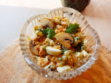 Салат с курицей, грибами и морковью готов! Немного его охладите. Перед подачей выложите салат в подходящий салатник. Приятного аппетита!