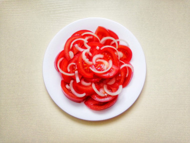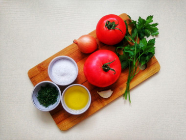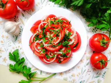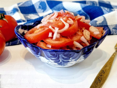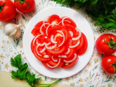 Легкий, быстрый и вкусный салат с помидорами и растительным маслом.