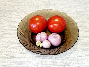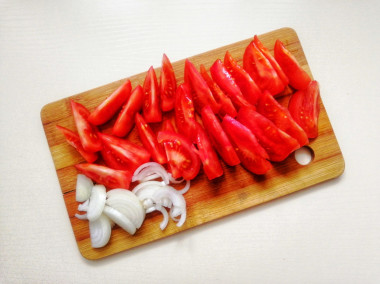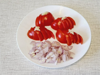 Помидоры нарезала дольками, лук полукольцами, петрушку и зубчик чеснока мелко нарезала.