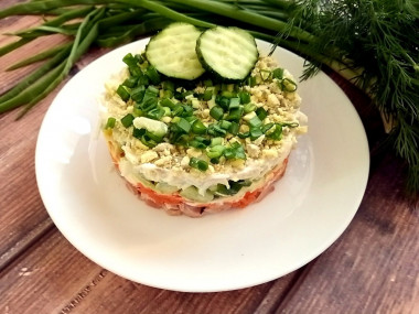 Снимите с салата сервировочное кольцо. Салат немного охладите, чтобы все ингредиенты стали одной температуры. Перед подачей салат украсьте на свой вкус. Приятного аппетита!