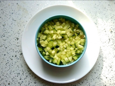 Свежий огурец помойте, отрежьте у него хвостики. Нарежьте огурец мелким кубиком и выложите равномерным слоем.