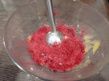 Всю массу необходимо измельчить. Это удобно сделать с помощью погружного блендера. Доводить массу до однородности необязательно (но не запрещается). Достаточно лишь разбить ягодки. Мне больше нравится, когда попадаются частички клюквы. Масса получается не жидкая и не густая. За счет добавленного меда она немного тягучая.