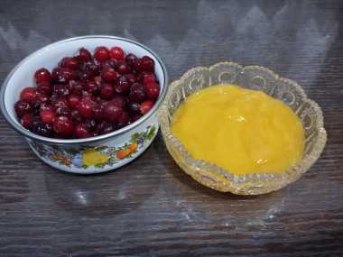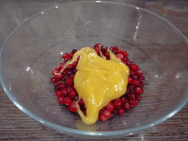 Сухие ягоды переложите в отдельную посуду и залейте медом. Даже если мед засахаренный, тоже добавляйте, не растапливая. Он смешается впоследствии с клюквенным соком и растворится.